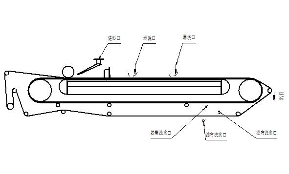 胶带式过滤机由橡胶滤带、真空箱、驱动辊、胶带支承台、进料斗、滤布调偏装置、驱动装置、滤布洗涤装置、机架等部件组成。它是充分利用物料重力和真空吸力实现固液分离的高效设备,它的工作原理如下: